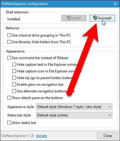 כדי לחזור לסייר הקבצים בסגנון Windows 10, בטל את הסימון של כל האפשרויות בתיבת הדו-שיח תצורת OldNewExplorer ובחר באפשרויות ברירת המחדל מתוך הרשימות הנפתחות בקטע מראה. לאחר מכן לחץ על "הסר התקנה" בקטע הרחבה של מעטפת.