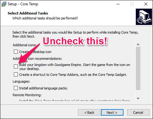 הורד את Core Temp מדף הבית שלה והתקין אותו במחשב שלך. הקפד מאוד לבטל את הסימון של התוכנה הכלולה בדף השלישי להתקנה! כברירת מחדל זו לא הוסרה עבורי, אך משתמשים אחרים ציינו כי היא מסומנת כברירת מחדל עבורם.