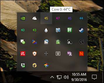 כאשר אתה מפעיל אותו, הוא יופיע כסמל או כסדרה של סמלים במגש המערכת שלך המציג את הטמפרטורה של המעבד שלך. אם למעבד שלך יש מספר ליבות (כמו שרוב המעבדים המודרניים עושים), הוא יציג סמלים מרובים - אחד לכל ליבה.