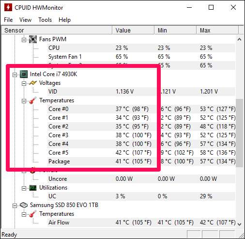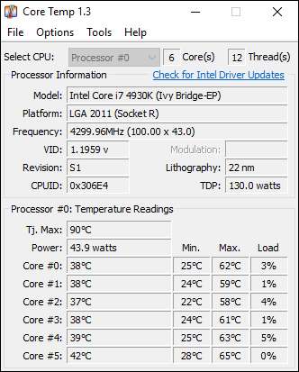 כדי למצוא את טמפרטורת המעבד שלך, גלול מטה אל הערך עבור המעבד שלך, למשל, הוא "Intel Core i7 4930K" - והסתכל על הטמפרטורות "Core #" ברשימה.