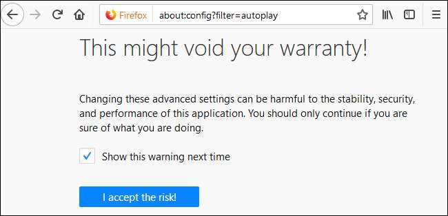 אל דאגה, להתעסק עם האפשרויות בערך: config לא יבטל למעשה אחריות כלשהי, וכל עוד תמלא אחר ההוראות האלה, סביר להניח שגם לא תפשל שום דבר. (ואם אי פעם תפשלו משהו, תוכלו לתקן את זה פשוט "מרענן" את פיירפוקס ). קדימה ובטל את הסימון "הצג אזהרה זו בפעם הבאה", ואז לחץ על "אני מקבל את הסיכון!"