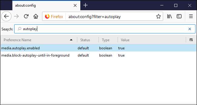 זה יביא אותך אל דף: תצורת התצורה, מסונן מראש כדי להציג רק אפשרויות עם "הפעלה אוטומטית" על שמם. לחץ פעמיים על "media.autoplay.enabled" כדי להחליף אותו מ- true לשקר.