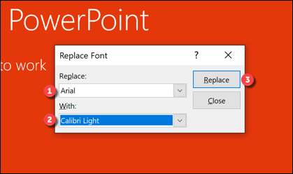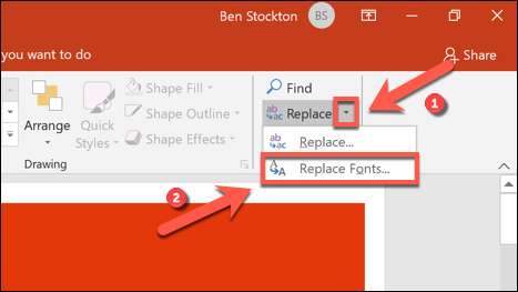 כדי להתחיל, לפתוח מצגת PowerPoint שלך. בכרטיסייה "הבית" בסרגל הכלים, לחץ על החץ שליד הלחצן "חלף". בתפריט הנפתח, בחר את האפשרות "חלף גופנים".