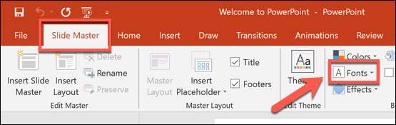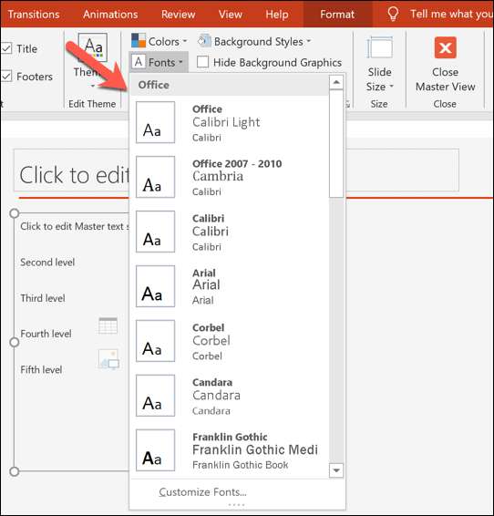 כדי לערוך את הגופנים המשמשים בתבנית שלך, בחר בלחצן "הגופנים", המופיע תחת לשונית "Slide Master" בסרגל הכלים.