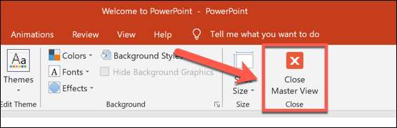 זה יעדכן את הגופן בשימוש ברחבי תבנית בסיס לשקפים PowerPoint שלך. לחץ על כפתור "התצוגה הראשית סגור" כדי להחיל את השינויים.