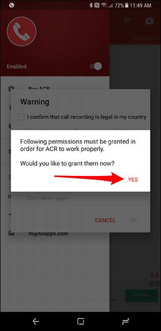 מיד לאחר הפעלת ACR, תצטרך לקבל את תנאיו - רשימה ארוכה למדי בהשוואה לרוב האפליקציות, אך בצדק. לאחר שתקבל את תנאי האפליקציה, עליך לתת לה את כל הגישה הנדרשת כדי לעשות את שלה: אנשי קשר, מיקרופון, טלפון ואחסון. אין שום דבר יוצא דופן עבור אפליקציה כזו, אז קדימה ואפשר לה לרוחב.