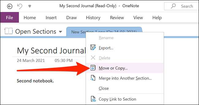 ההערה שנבחרה תפתח על המסך. הנה, לחץ באמצעות לחצן העכבר הימני על סעיף הערה או שם הדף בחלק העליון ובחר "העבר או העתק". פעולה זו תסייע לשחזר את הפתק שלך למחברות הקיימות שלך.