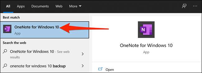כדי להתחיל את תהליך השחזור, גש לתפריט "התחל" שלך, חפש "OneNote עבור Windows 10", ולחץ על האפליקציה בתוצאות.