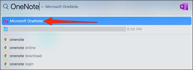 כדי להתחיל, פתוח זרקור על ידי לחיצה על Command + מקש רווח, להקליד "OneNote," ובחר את האפליקציה בתוצאות החיפוש.