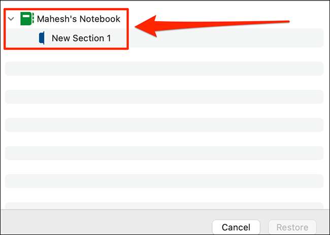 כאן, לחץ על המחברת שברצונך להתאושש בחלונית השמאלית. לאחר מכן, לחץ על "שחזור" בראש כדי לשים את המחברת שלך למיקום המקורי.