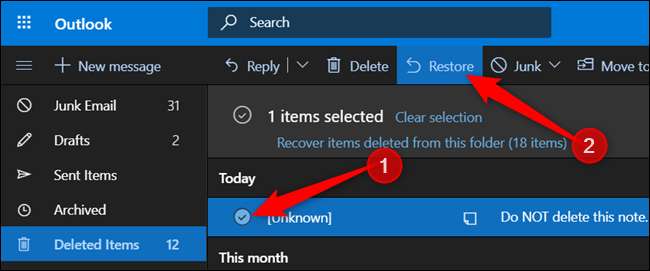 לאחר הכניסה, גלול למטה בחלונית השמאלית ולחץ על "פריטים שנמחקו".