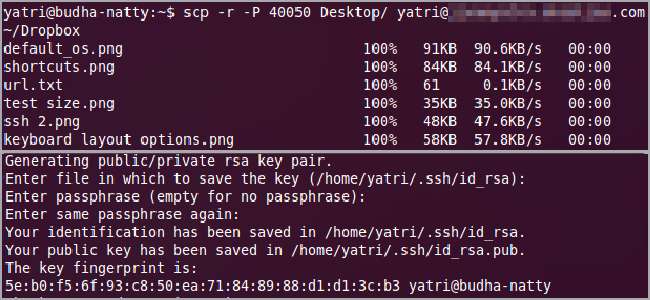 לאחר מכן תתבקש להזין ביטוי סיסמה. לחץ על Enter כדי להשאיר את זה ריק ואז לעשות זאת שוב כאשר הוא מבקש אישור. השלב הבא הוא העתקת קובץ המפתח הציבורי למחשב המרוחק שלך. אתה יכול להשתמש ב- scp כדי לעשות זאת: