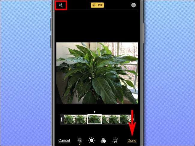 לאחר אישור על סמל הדובר צהוב, הסמל ישתנה לסמל רמקול אפור עם שביתה דרכה, מראה לך כי השמע עבור התמונה Live הושבת. לאחר מכן הקש "בוצע".