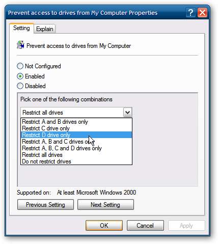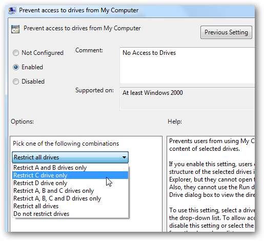 בחר הפעל ואז תחת אפשרויות מהתפריט הנפתח אתה יכול להגביל כונן מסוים, שילוב של כוננים או להגביל את כולם. הכונן הראשי שכנראה תרצה להגביל הוא כונן C: \ או על איזה כונן עם אותיות אי פעם ש- Windows מותקן. הגבלת כל הכוננים פירושה שהם אינם יכולים לגשת לכונן התקליטורים או ה- DVD, ואינם יכולים להשתמש בכונן הבזק אם הם צריכים להשיג קבצים ממנו.