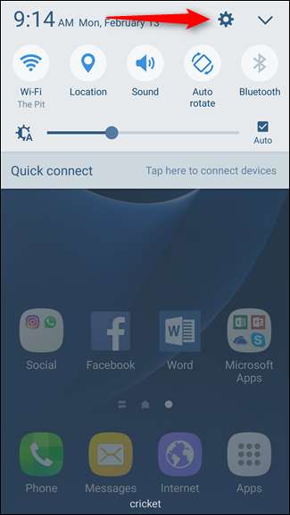 אם אתה משתמש בטלפון עם אנדרואיד 5.x Lollipop או 6.x Marshmallow, הטיפול ברשתות Wi-Fi מדוד הוא מעט שונה, אך עדיין קל מאוד. התחל על ידי משיכת מטה את מגש ההודעות והקשה על גלגל השיניים של ההגדרות. במכשירים מסוימים ייתכן שיהיה עליך למשוך פעמיים. (אנו משתמשים בסמסונג גלקסי S7 בדוגמה זו.)