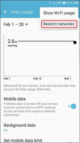 בחלק התחתון, תופיע קטע שכותרתו "Wi-Fi". אתה יכול לראות כמה נתונים נעשה שימוש ב- Wi-Fi באמצעות הלחצן "שימוש בנתוני Wi-Fi". הקש על כפתור "הגבלות הרשת" (יתכן שהוא מתויג מעט אחרת בהתאם ליצרן שלך).