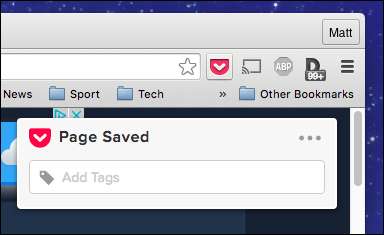 סיומת הדפדפן Pocket היא הדרך החזקה ביותר לשמור מאמרים ב- Pocket, לכן נדגים זאת תחילה. כשתגיע לדף אינטרנט (מאמר, ידיעות חדשות או הדרכה מהאתר המועדף עליו), פשוט לחץ על סמל הכיס בסרגל הכלים של הדפדפן.