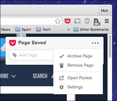 אם תלחץ על שלוש הנקודות, יוצגו לך אפשרויות נוספות: ארכיב או הסר את הדף, פתח אותו בכיס או גש להגדרות.