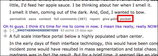 שמירה מהירה יכולה להיות שימושית אם אתה דפדפן רגיל של Twitter, Hacker News או Reddit. הם בעצם מוסיפים כפתור כיס לדפים האלה. ב- Reddit, למשל, תראה אפשרות חדשה לשמור פוסטים ותגובות, כשתמצא משהו מעניין באמת שתרצה להקדיש לו תשומת לב רבה יותר בהמשך.