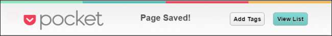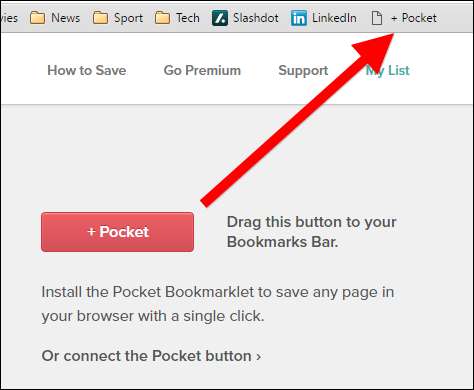 ל- Pocket יש גם סימניה, שאותה תוכלו להוסיף לסרגל הכלים של הסימניות של הדפדפן. אין לו כל כך הרבה תכונות (כל מה שהוא עושה זה לשלוח את כתובת ה- URL לכיס), אבל אתה לא צריך להתקין סיומת, וזה נחמד. כדי להוסיף את הסימנייה, פשוט גרור את הכפתור מדף הבית של Pocket לסרגל הסימניות של הדפדפן.