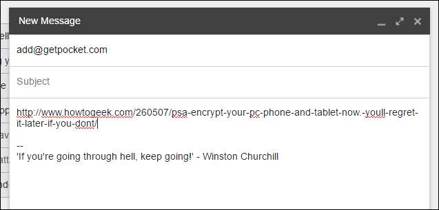 לבסוף, אם אתה נמצא במחשב אחר שבו אין לך גישה לכפתור Pocket, תוכל להוסיף מאמרים גם בדוא"ל. לעשות את זה פשוט מאוד. פשוט פתח הודעה חדשה מחשבון הדוא"ל שבה אתה משתמש כדי להיכנס לכיס שלך.