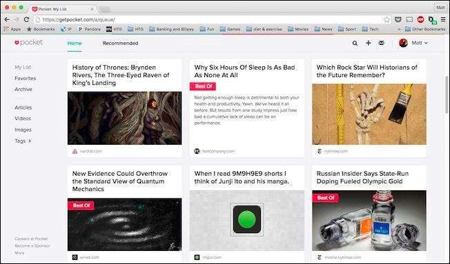 כדי לגשת לתור ה- Pocket שלך מכל דפדפן אינטרנט, עליך לעבור אל GetPocket.com . שם תמצא את כל מה שחסכת אי פעם.