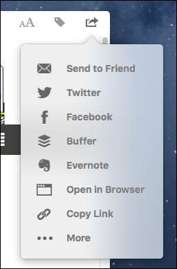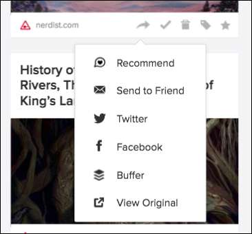 שיתוף מאפשר לך (ניחשת נכון) לשתף מאמרים לשירותים שונים, כגון טוויטר, פייסבוק ובופר. אתה יכול גם להמליץ על משהו בפרופיל ה- Pocket שלך, או לשלוח משהו בדוא"ל לחבר. לבסוף, אתה יכול להשתמש בזה כדי להציג את המאמר המקורי, וזה שימושי כאשר אתה רוצה לשתף את כתובת האתר ישירות עם מישהו באמצעות צ'אט או טקסט. (או אם ברצונך לקרוא את ההערות בדף המקורי.)