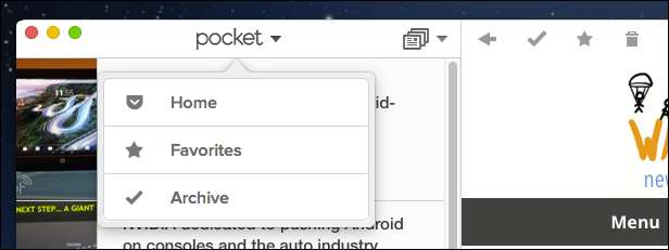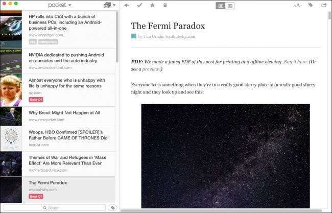 ל- Android, iOS ו- OS X יש אפליקציות Pocket ייעודיות. אם אתה משתמש ב- Windows או Linux, אין לך מזל רשמית. יש מספר אפליקציות שנוצרו על ידי משתמשים שתוכלו לנסות , שעשוי להתאים לחשבון, אבל בכנות, הדפדפן מתאים לקריאה בשולחן העבודה - האפליקציות באמת מבריקות בנייד. לכל מי שמשתמש במערכת הפעלה ניידת שאינה אנדרואיד או iOS, אתה יכול עיין בדף אינטרנט זה למידע נוסף.