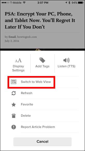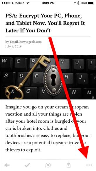 אפשרויות המאמרים ברורות למדי באפליקציית שולחן העבודה, אך בגרסת המובייל תצטרך להחליק שמאלה או ימינה במאמר באמצעות אפליקציית iOS, או לחץ לחיצה ארוכה על גרסת Android.