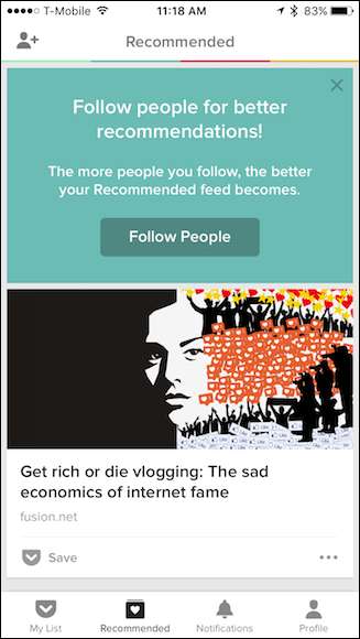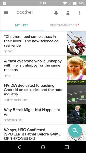 כשאתה פותח את אפליקציית ה- Pocket, תראה רשימה של המאמרים שלך בכיס.