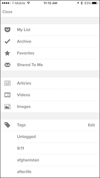 הקשה על סמל זה פותחת חלונית ניווט שממנה תוכלו לשנות לתצוגות שונות, וחשוב מכך, לנפות את המאמר שלכם באמצעות תגים. המראה בין גרסאות iOS ו- Android שונה, אך האפשרויות זהות למדי למעט אפליקציית Android כוללת אפשרות לשדרוג ל- Pocket Premium.
