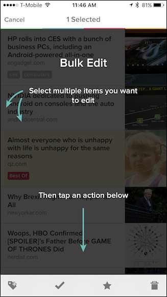 לביצוע עריכות בכמות גדולה באפליקציה לנייד, פשוט לחץ לחיצה ארוכה על מאמר כדי להתחיל לבחור פריטים בגרסת iOS.