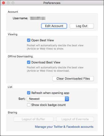אם תבחר לבדוק את ההגדרות, תוכל להתנתק, להפעיל או לשנות את קיצור המקשים לשמירת מאמרים, ולהפעיל את שירות השמירה המהיר עבור כמה אתרים שונים (Twitter, Hacker News ו- Reddit).