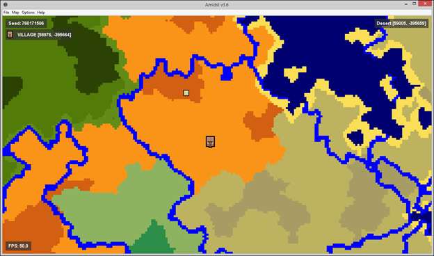 נניח שאנחנו רוצים כפר מדברי עם מקדש מדברי בקרבת מקום. קל מספיק להתקרב למפת AMIDST ולמצוא את ההתאמה אותה אנו מחפשים.