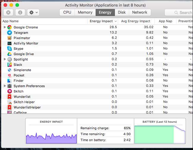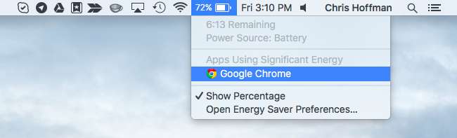 אפל מנסה לפשט דברים ולחשוף רק מידע בסיסי לשימוש באנרגיה לרוב המשתמשים. לכן OS X רק מצביע על כמה חזירי אנרגיה מסוימים במקום לתת לך רשימה מלאה של כמה עוצמה שכל אפליקציה השתמשה בה, כפי שאתה יכול במערכות הפעלה ניידות כמו iOS של אפל ואנדרואיד של גוגל.