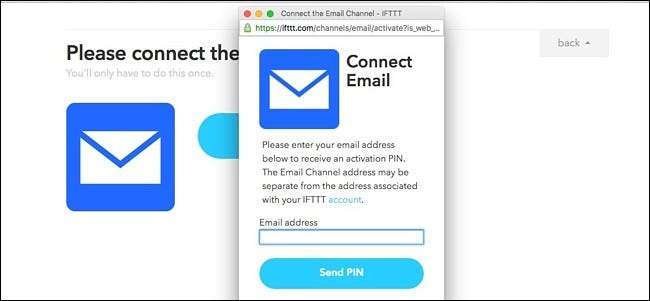 כדי לחבר את ערוץ הדוא"ל, הזן את כתובת הדוא"ל שלך והזן את ה- PIN שיישלח אליך בדוא"ל מ- IFTTT.