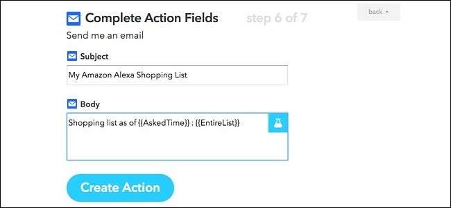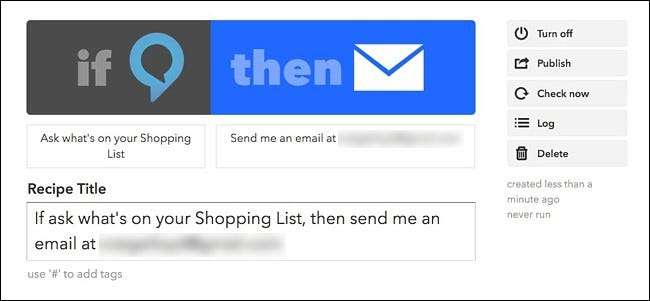 המתכון שלך מוכן כעת לשימוש, כך שבכל פעם שתשאל את Alexa מה ברשימת הקניות שלך, תקבל אותו בדוא"ל שלך. שוב, אתה יכול גם לשלוח אותו למגוון שירותים אחרים ש- IFTTT תומך בהם, כמו Evernote, Day One, iOS תזכורות ועוד.