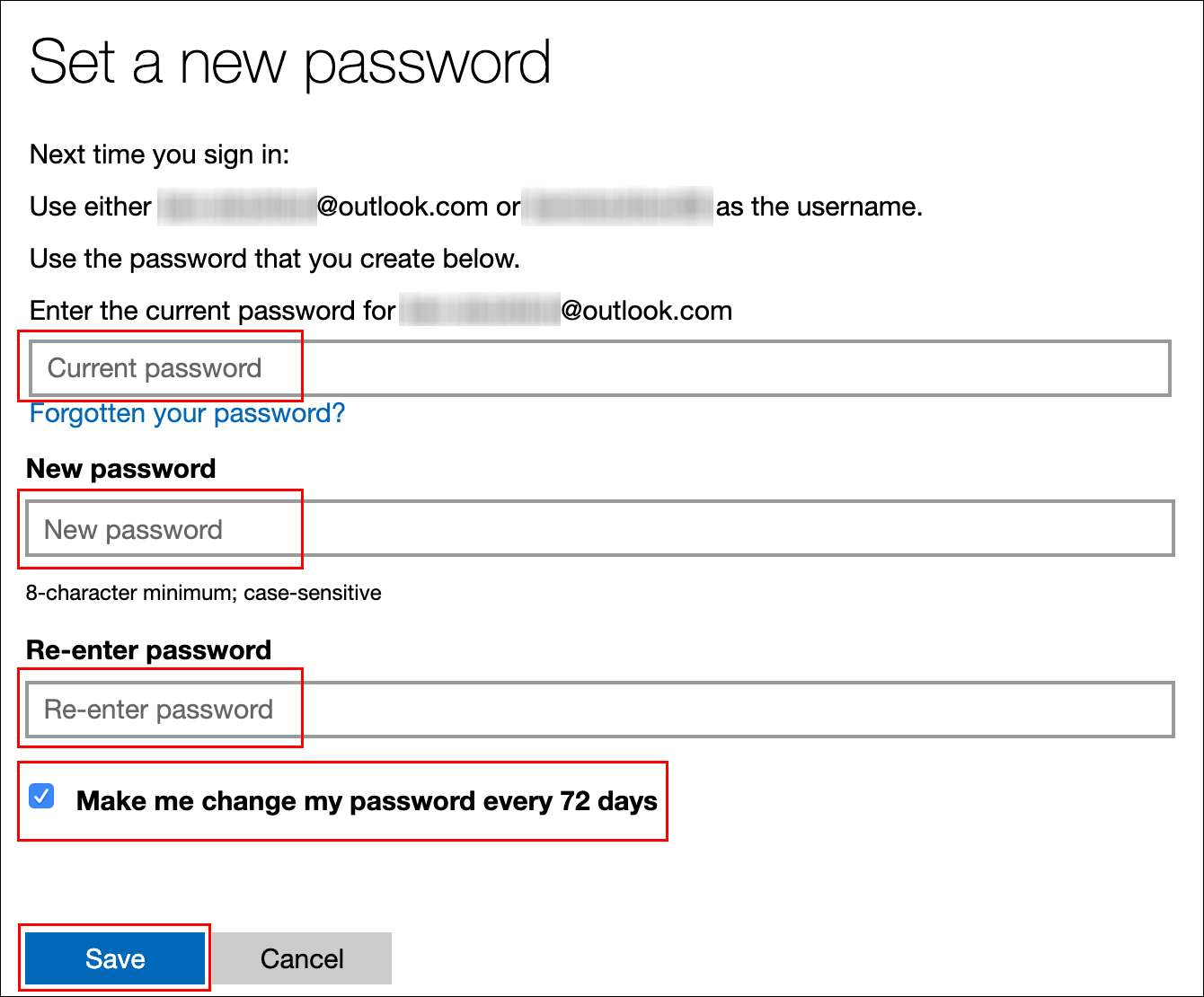 באפשרותך להגדיר תאריך תפוגה של סיסמה לחשבון Microsoft שלך באופן מקוון. לאחר מכן תתבקש לאפס את הסיסמה כל 72 יום. עליך להגדיר סיסמה חדשה לפני שתוכל להפעיל (או להשבית) הגדרה זו.