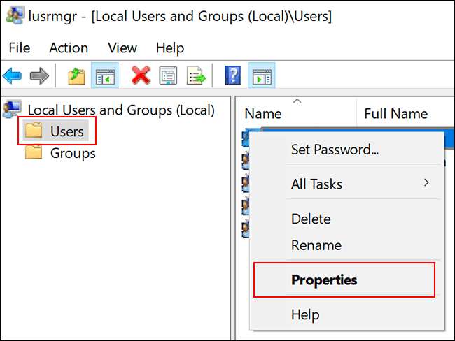 כאן, לחץ על "משתמשים" בתפריט משמאל, ואז לחץ באמצעות לחצן העכבר הימני על חשבון המשתמש שלך. לחץ על "מאפיינים" כדי להזין את הגדרות המשתמש המתקדמות עבור חשבון המשתמש המקומי שלך.