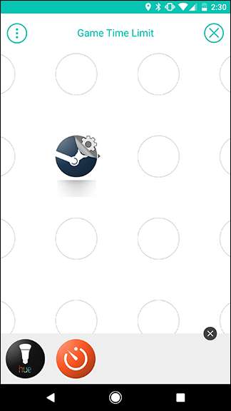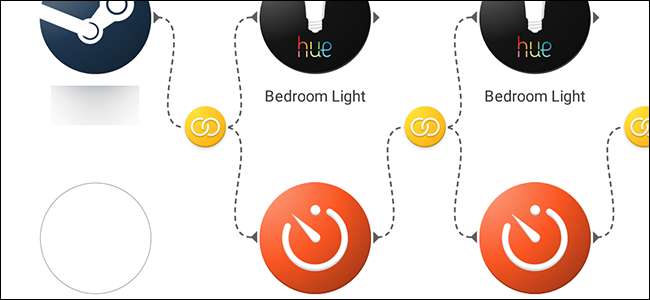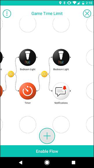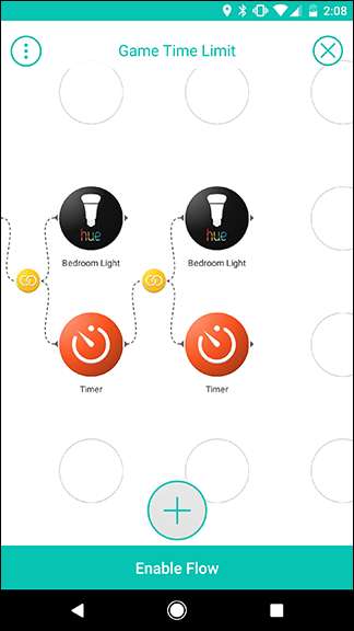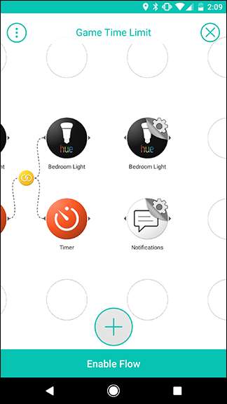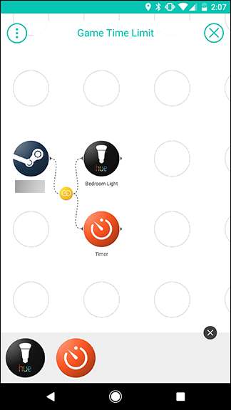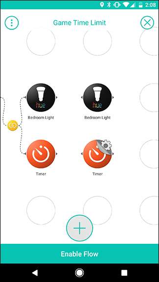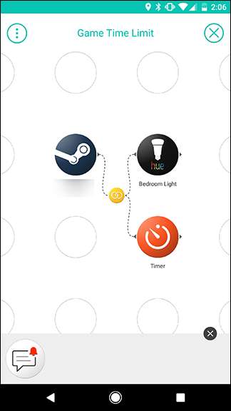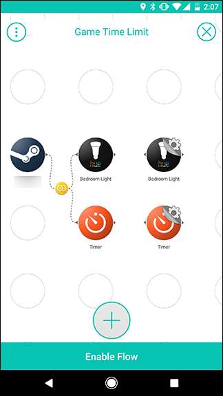זו גם הדגמה שימושית כיצד אחד הדברים שלך יכול להיות גם פעולה וגם גורם. הטיימר הראשון הוא פעולה עבור ההדק Steam (הפעלת משחק), ומשמש גם כטריגר לטיימר הבא, כמו גם שינוי אור. על ידי שרשור דייזי מספר טריגרים ופעולות יחד, אתה יכול ליצור משימות אוטומטיות מורכבות להפליא עם זרימה אחת.