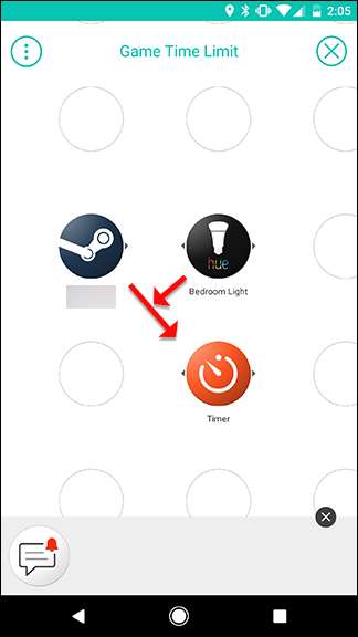 חזרה למסך הרשת, החלק מסמל ה- Steam לסמל הטיימר כדי ליצור קישור. לאחר מכן, החלק מסמל הגוון לעיגול הצהוב בקישור הראשון שיצרת זה עתה. התוצאה צריכה להיראות כמו התמונה השנייה למטה. זה יגרום להדק Steam להפעיל בו זמנית גם את נורית הגוון וגם את הטיימר.