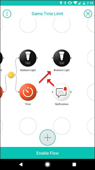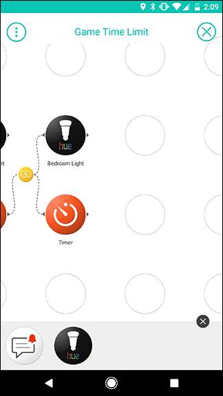 כשאתה חוזר למסך הרשת, אתה הולך לחבר את שתי הפעולות החדשות האלה לטיימר הקודם בדיוק כמו שעשית בפעם הקודמת. החלק מהטיימר הקודם אל אור הגוון כדי ליצור קישור. לאחר מכן, החלק מהדק ההודעות לסמל הקישור הצהוב שיצרת זה עתה. התוצאה צריכה להיראות כמו התמונה מימין.