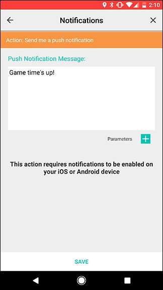 הפעולה היחידה ברשימה היא "שלח לי הודעת דחיפה". זה יישלח אל שֶׁלְךָ טלפון, לא המכשיר של ילדך, כדי שתוכל לגלות מתי הם השקיעו מספיק זמן במשחקים היום. במסך הבא, הזן הודעה שברצונך לקבל כגון "זמן המשחק נגמר!" והקש על שמור.