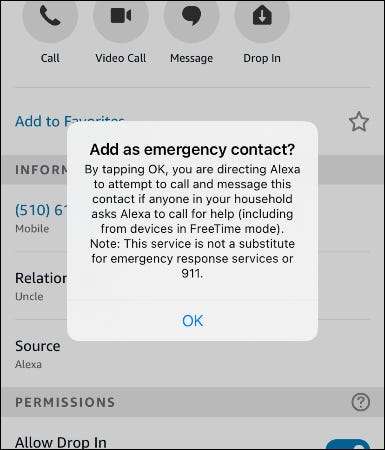במסך הבא, גלול למטה תחת "הרשאות" ובחר "הוסף מגע חירום". פעולה זו תנחה תיבת דו-שיח שמבקשת ממך לאשר כי Alexa הוא בסדר לנסות להתקשר ולהצהיר את איש הקשר לעזרה. הקש על "אישור".