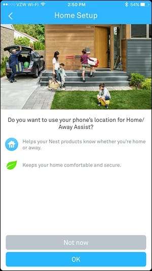 במסך הבא תוכלו להגדיר עזרה ביתית / רחוק , שמשתמש במיקום הטלפון שלך כדי לקבוע אם אתה בבית או לא - כך, הוא יכול להפעיל את המצלמה באופן אוטומטי כשאתה יוצא מהבית. אתה יכול לבחור שלא להגדיר אותו עכשיו (תוכל לעשות זאת בהמשך).