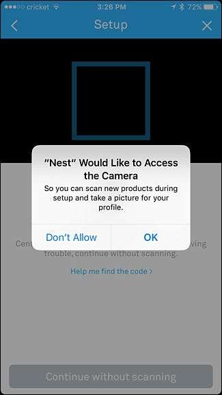 בשלב הבא תצטרך לתת לאפליקציית Nest גישה למצלמת הטלפון שלך כדי שתוכל לסרוק במהירות את קוד ה- QR בגב מצלמת Nest. אתה יכול גם לשלול אישור, אם תרצה, ולחץ על "המשך ללא סריקה", שינחה אותך להקליד את מפתח הכניסה או את המספר הסידורי של ההתקן. כך או כך, אתר את הקוד בגב ה- Cam Cam וסרוק אותו באמצעות האפליקציה או הזן את המספר הסידורי.
