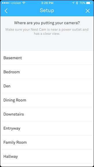 בחר מרשימת המיקומים בבית שלך שבהם תוגדר ה- Nest Cam שלך. זה מקל על הבחנה ביניהם אם יש לך מספר מצלמות Nest.
