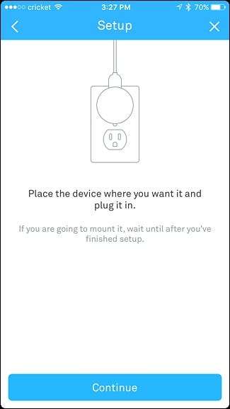 אם עדיין לא עשית זאת, הצב את Nest Cam היכן שתרצה והשתמש בכבל ובמתאם הכלולים בכדי לחבר אותו לשקע קרוב. לחץ על "המשך" באפליקציה.