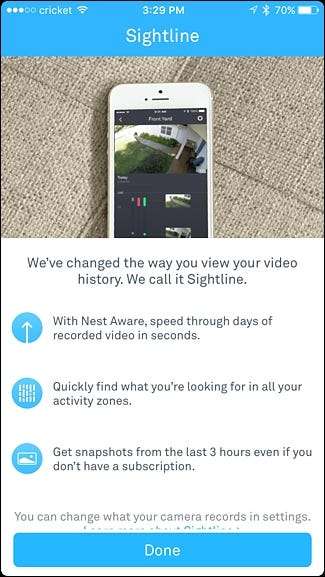 המסך הבא ילמד אתכם על Sightline, תכונה של Nest Cam המאפשרת לכם לגלול במהירות בין שעות צילומים ולעבור לנקודות ספציפיות כאשר זוהתה פעילות. הכה "בוצע" בתחתית.