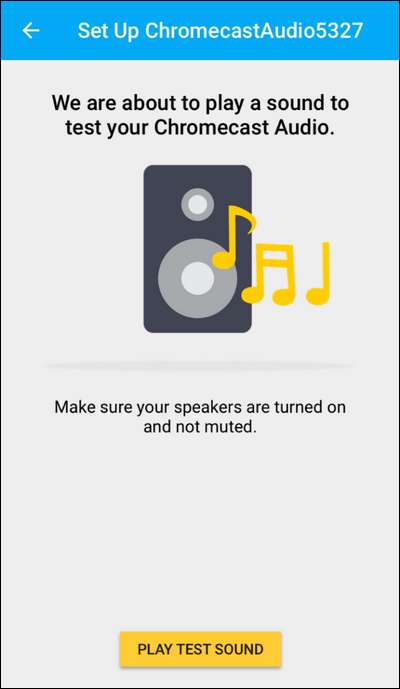 אם מכשיר ה- Bluetooth פועל ונמצא ליד ה- Chromecast, הוא יציג את שם ברירת המחדל של ה- Chromecast Audio יחד עם תיבת הדו-שיח לעיל המציינת כי יש להגדירו. בחר "הגדר". לאחר רגע קצר מאוד בו הוא מציין את תהליך ההתקנה, הוא יבקש ממך להשמיע צליל בדיקה. לחץ על הלחצן כדי לאשר שהאפליקציה יכולה לשלוח צליל ל- Chromecast Audio.